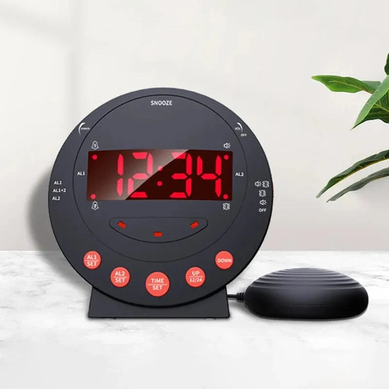 La nostra Sveglia con vibrazione per sordi nera unisce un design moderno e discreto a funzionalità avanzate. L'ampio display a LED rosso è facile da leggere anche al buio, e i pulsanti grandi e intuitivi rendono l'impostazione un gioco da ragazzi. Puoi scegliere tra diverse modalità di allarme: solo vibrazione, solo suono (con volume regolabile) o una combinazione di entrambi, per adattarsi perfettamente alle tue esigenze. La sua finitura nera elegante la rende un complemento d'arredo discreto e funzionale per qualsiasi comodino.