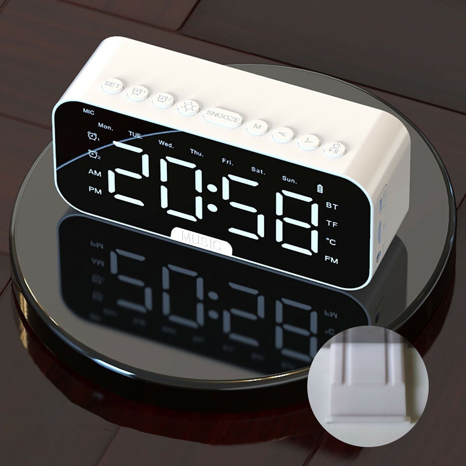 - Display Digitale Grande e Chiaro: L'ora è ben visibile, con indicatori per il giorno della settimana (Mon-Sun), AM/PM e la modalità attiva (BT, TF, FM).