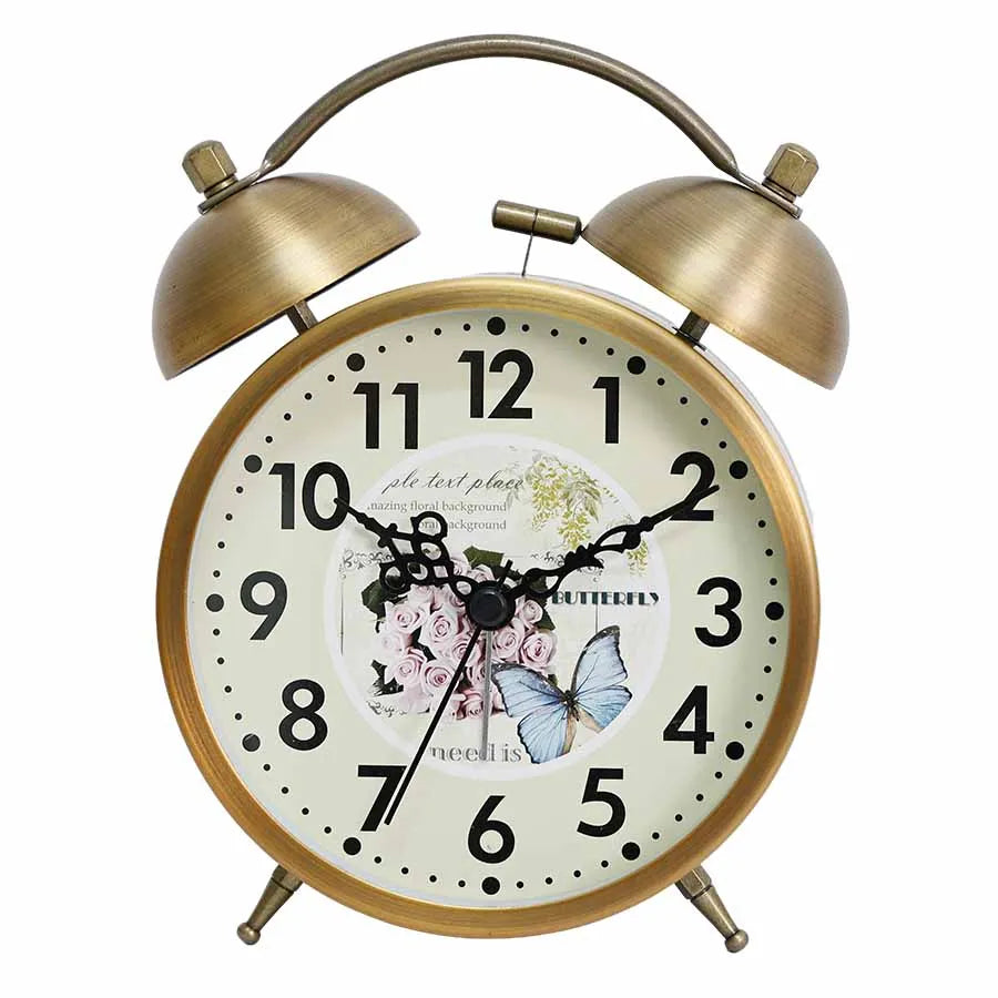 Questa sveglia non è solo bella da vedere, ma è anche incredibilmente funzionale. Il suo design robusto e i suoi campanelli metallici garantiscono un suono chiaro e forte, assicurandoti di non perdere mai un appuntamento importante. Il quadrante ampio con numeri ben leggibili e il delicato motivo floreale con una farfalla blu creano un'atmosfera serena, rendendo il tuo comodino un angolo ancora più accogliente. È un pezzo che non passa inosservato, capace di raccontare una storia e di aggiungere personalità al tuo spazio.